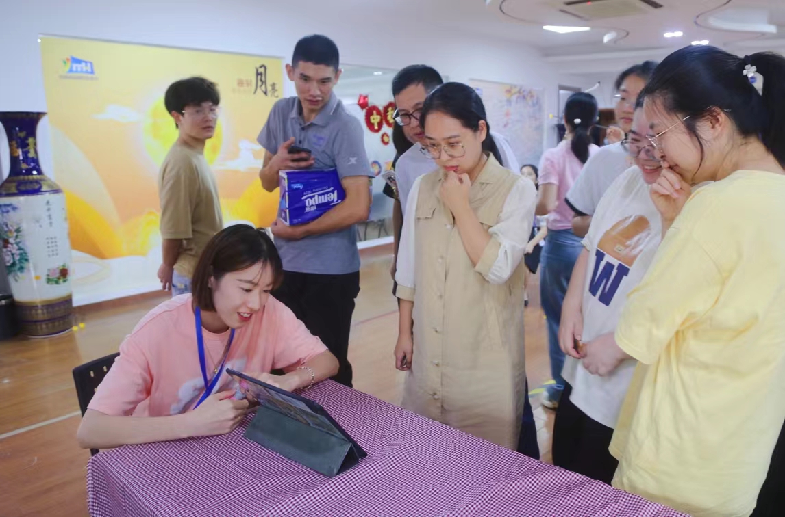 中午12點,國貿(mào)六樓活動區(qū)人頭攢動,大家興致勃勃地前來打卡中秋游園會,感受濃郁的節(jié)日氣氛。現(xiàn)場共有5個項目,分別是團(tuán)圓中秋、旱地冰壺、巧猜燈謎、趣射月亮和詩意中秋,成功過關(guān)其中兩項,即可獲得博餅一次。對此,大家都躊躇滿志,躍躍欲試。第一項是團(tuán)圓中秋。站在精美的中秋背景板前,大家紛紛拿出手機(jī)自拍或他拍,然后分享到微信朋友圈,向親朋好友傳遞快樂。第二項是旱地冰壺。握住冰壺,用巧勁輕輕一推,沒輪到的人的心情也隨著冰壺的移動上下起伏。哇,冰壺不偏不倚正中紅心,周圍一片歡呼!第三項是巧猜燈謎。緊鎖眉頭,絞盡腦汁,猜燈謎的小伙伴們都陷入了沉思,反復(fù)思索后,說出答案,回答正確。第四項是趣射月亮。箭在弦上不得不發(fā),調(diào)整站姿,把握力道,一松手,啪的一聲,命中月亮。最后一項是詩意中秋。“海上生明月,天涯共此時”“但愿人長久,千里共嬋娟”“舉頭望明月,低頭思故鄉(xiāng)”……書寫著中秋詩句,感受著細(xì)膩鄉(xiāng)思,更感念團(tuán)圓的美好。