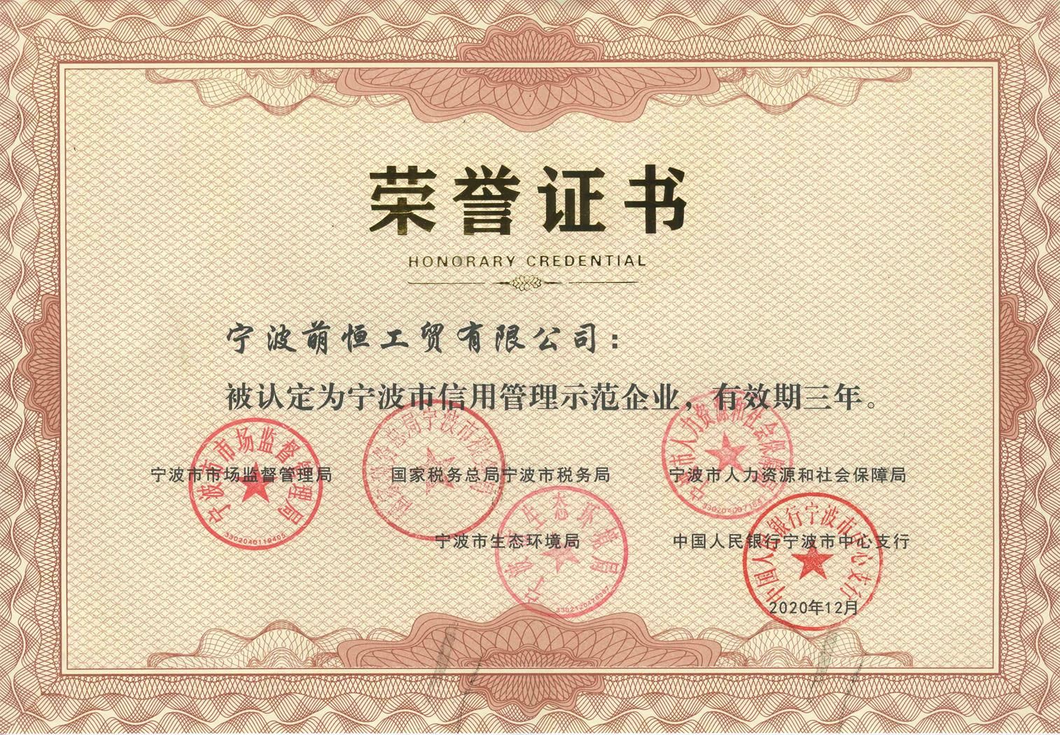 信用作為企業的無形資產,是企業良好社會形象的重要構成要素。近日,2020年度“寧波市信用管理示范企業”名單出爐,寧波萌恒工貿有限公司榜上有名。