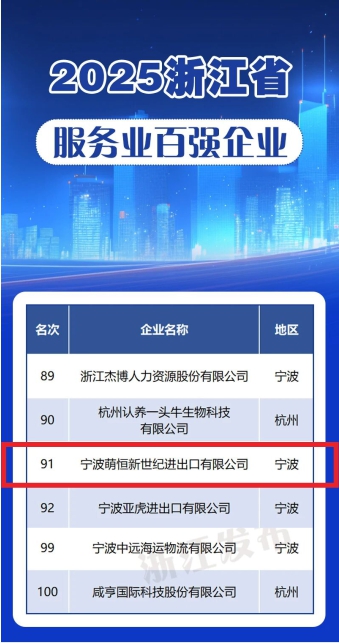 浙江省服務業百強企業榜單是衡量我省服務業企業綜合競爭力的重要標尺,入選企業均為在各行業中具有引領作用和突出貢獻的標桿。萌恒新世紀能夠躋身其中,不僅是對公司過去一年經營成果的充分肯定,更是對全體員工不懈努力、團結拼搏的有力證明。